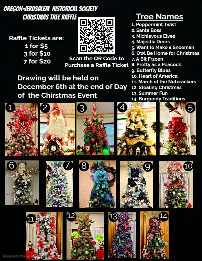 The Oregon-Jerusalem Historical Society is holding a Christmas Tree Raffle.